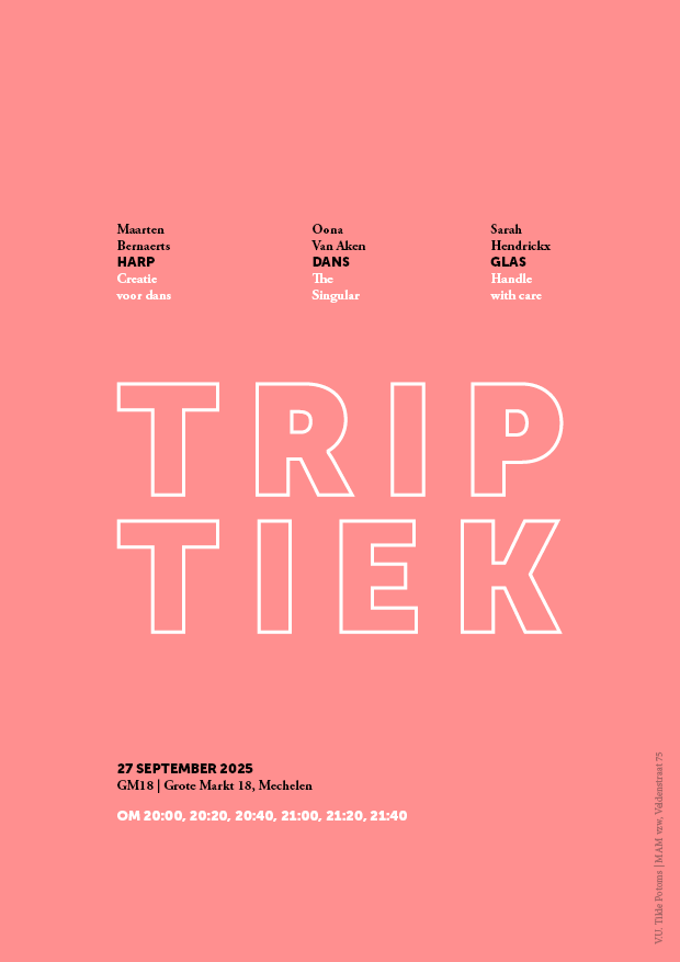 Zaterdag 27 september. Performances van TRIPTIEK om 20:00 I 20:20 I 20:40 I 21:00 I 21:20 I 21:40. De afscheidsreceptie start om 20:00 en is doorlopend toegankelijk.